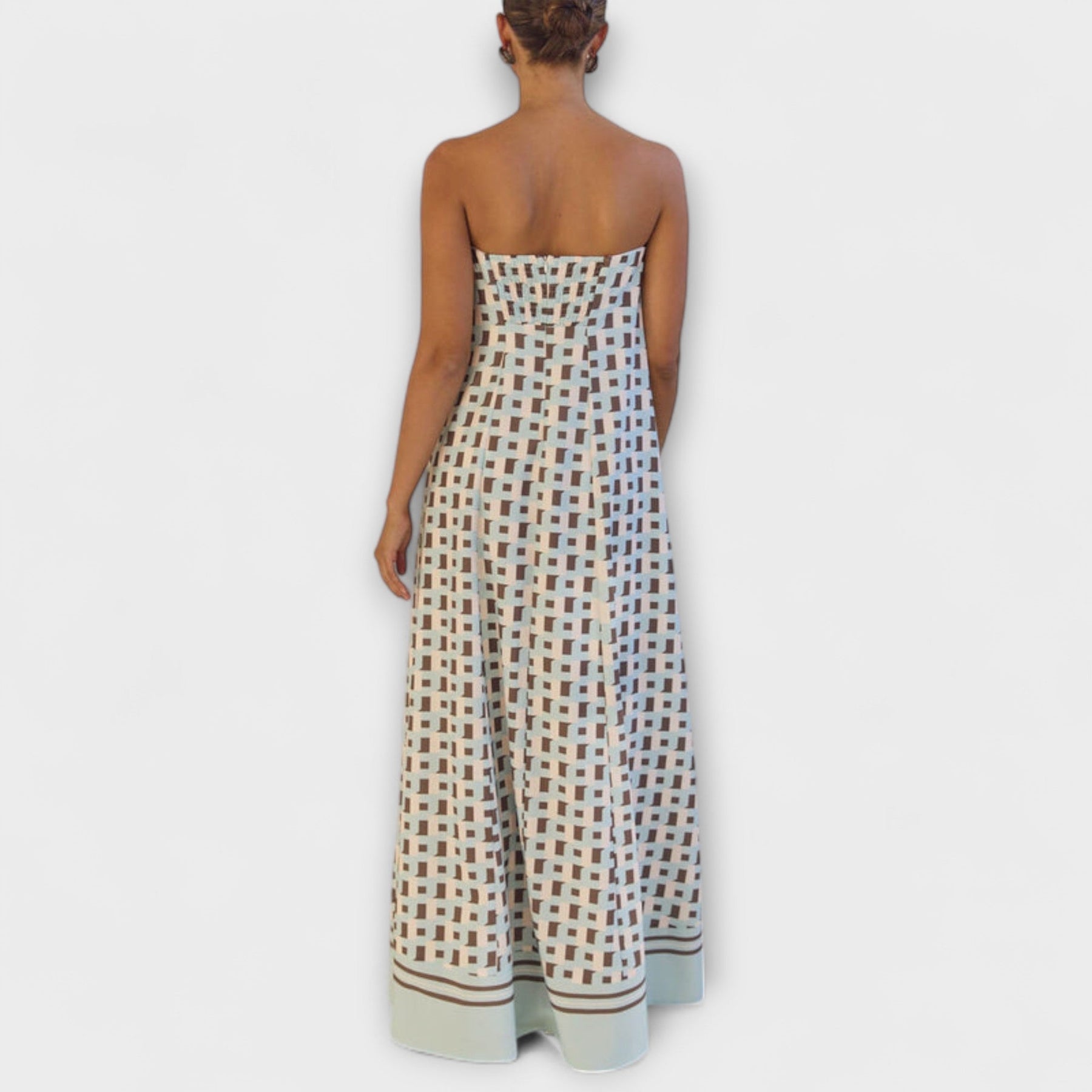 Odvážné, umělecké a bez námahy elegantní, tyto maxi šaty s odhalenými rameny mají exkluzivní geometrický potisk, který přitahuje pozornost. Ideální pro jakoukoli příležitost, od letních večírků po stylové denní výlety, tyto šaty jsou vaší volbou pro sofistikovanou eleganci.