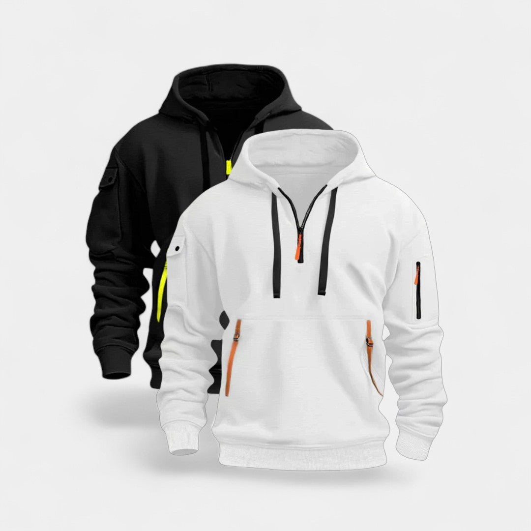 Tento balíček dvou mikin Filip spojuje moderní design s každodenním pohodlím. Díky kontrastním detailům, funkčním kapsám a praktickému zipu vyniká originálním vzhledem, který se hodí pro městský život i volný čas. Dvě univerzální barvy vám umožní snadno kombinovat outfity podle nálady – vždy stylově, vždy pohodlně.
