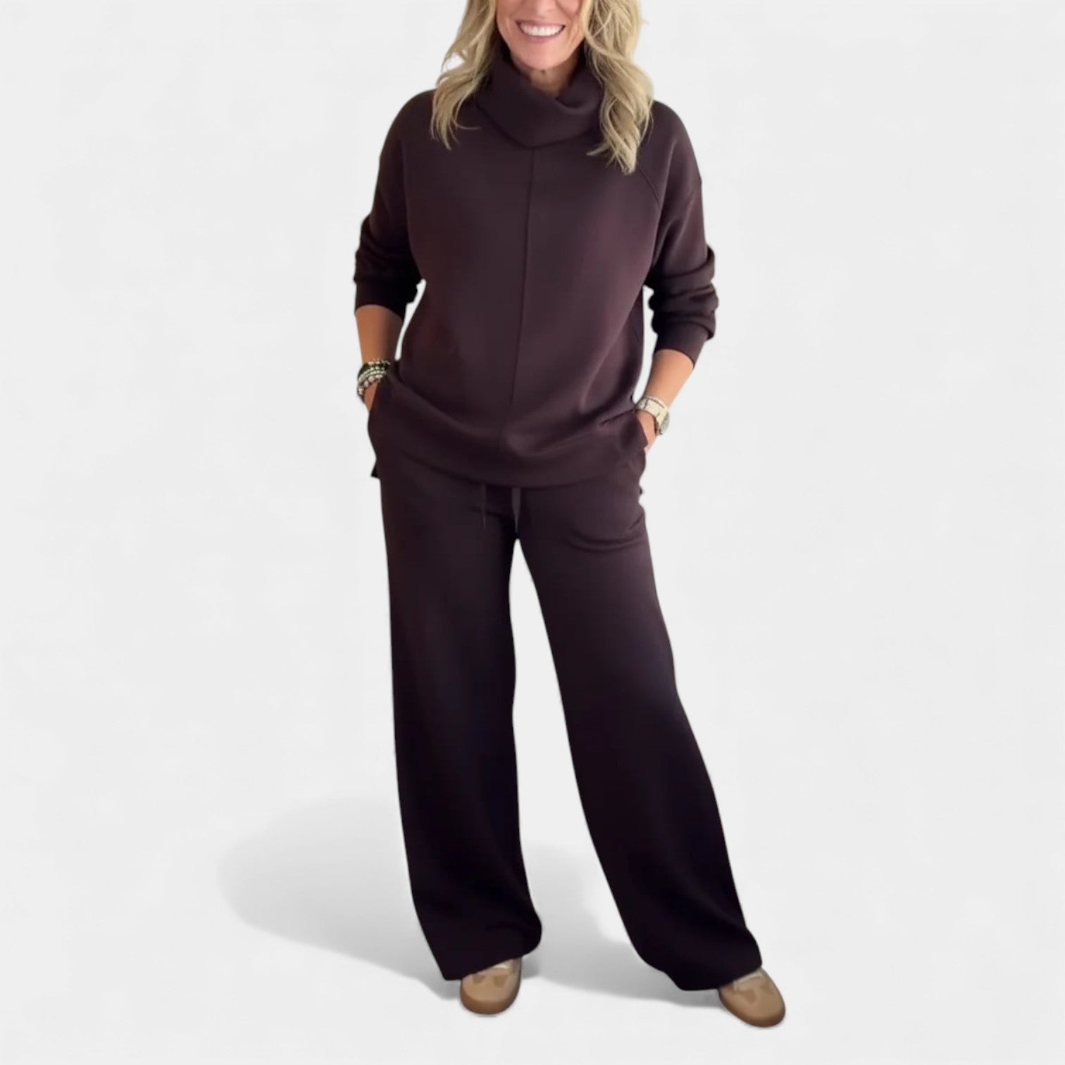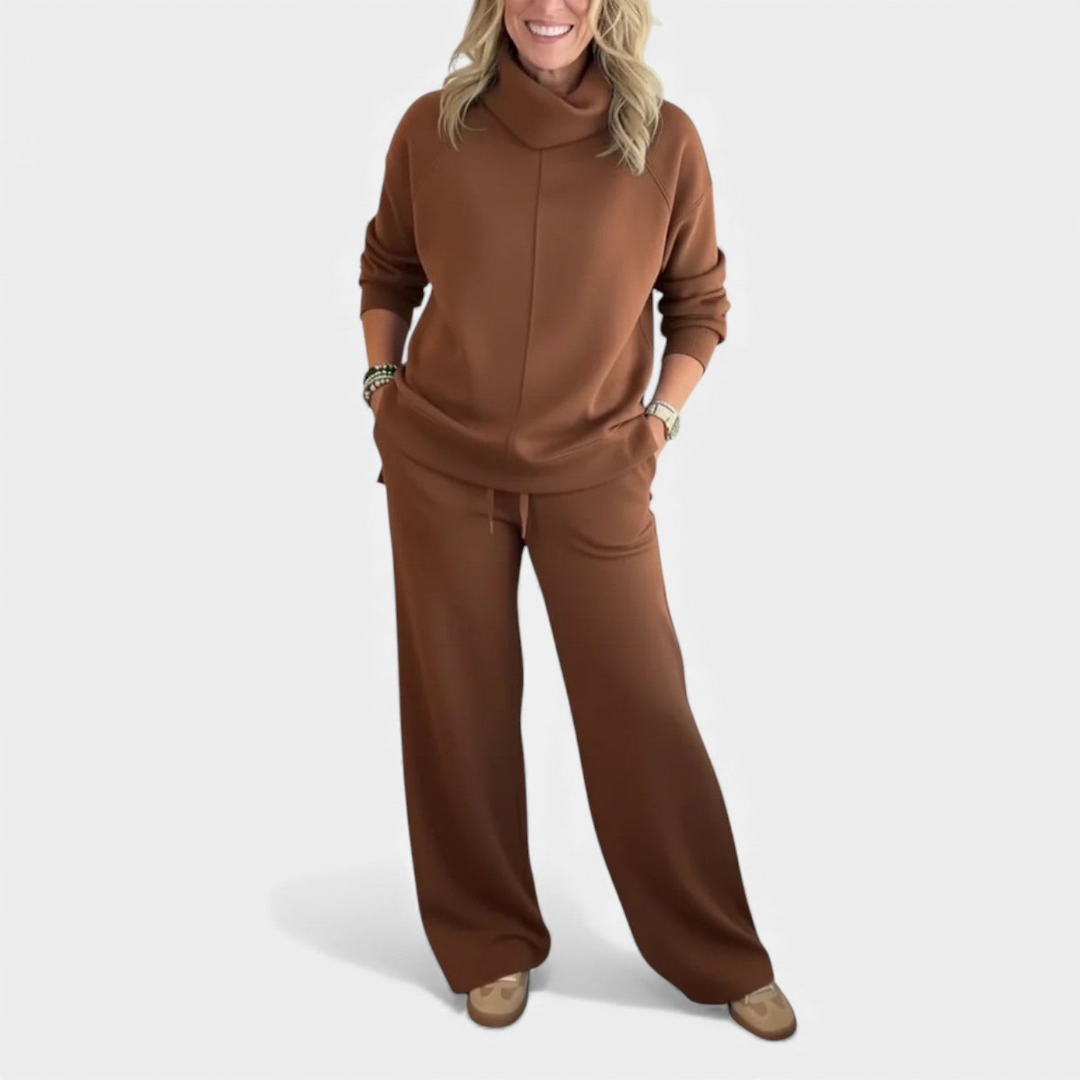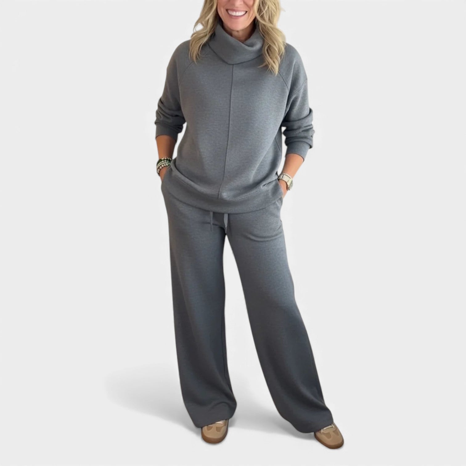 Komplet Marjeta je navržen pro ženy, které chtějí vypadat upraveně a zároveň se cítit mimořádně pohodlně. Měkká pletenina, volný límec a široké kalhoty vytvářejí vzhled, který je ideální pro cestování, práci nebo uvolněné dny doma.