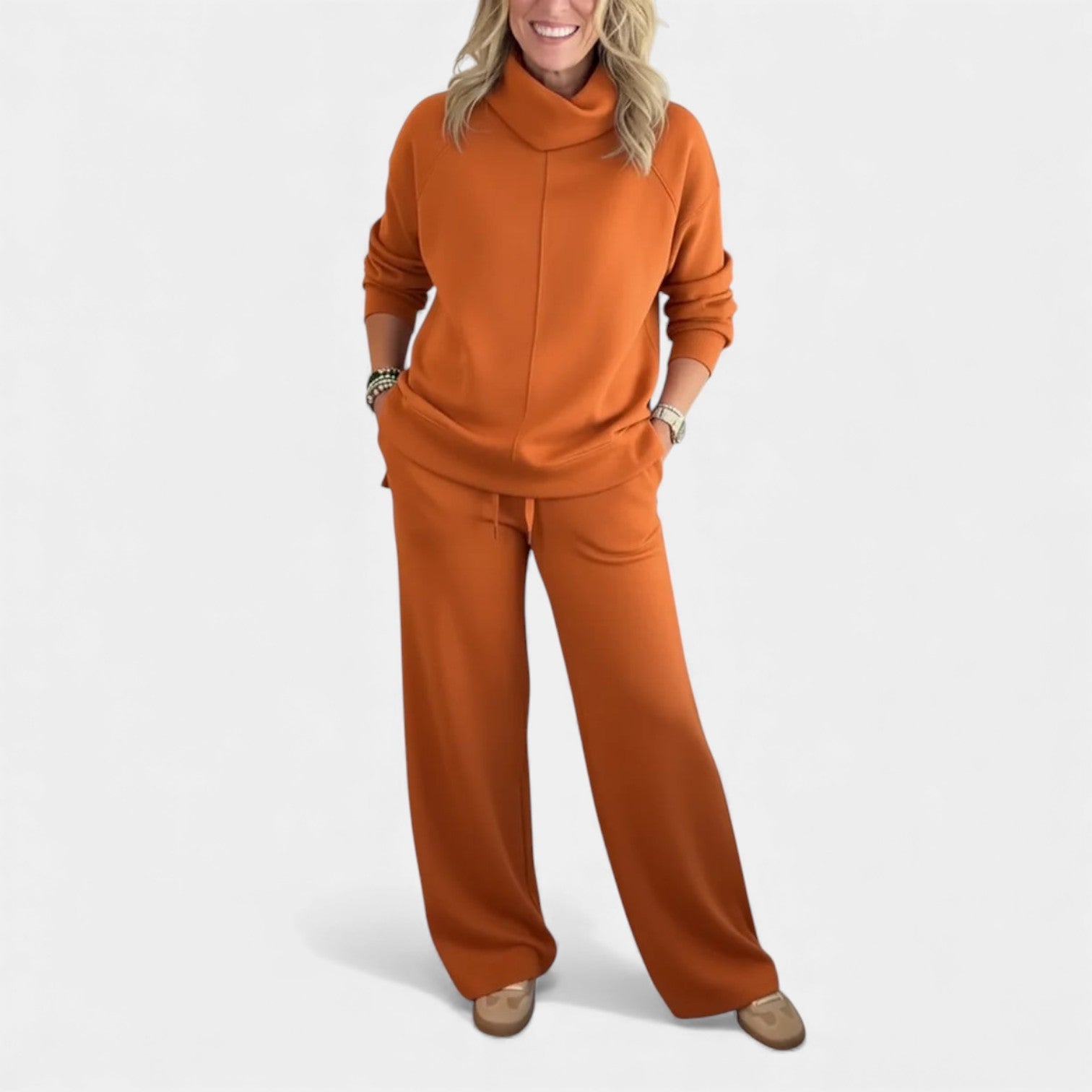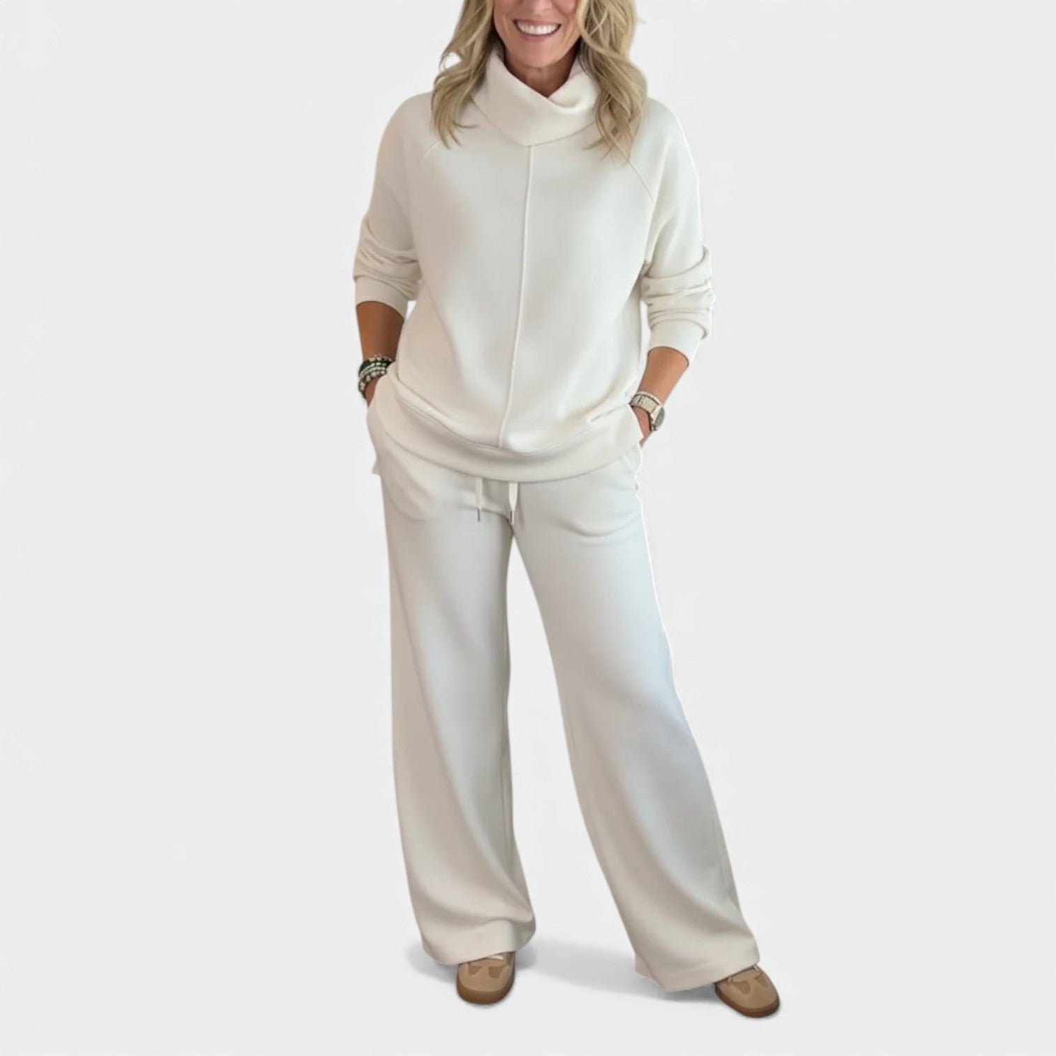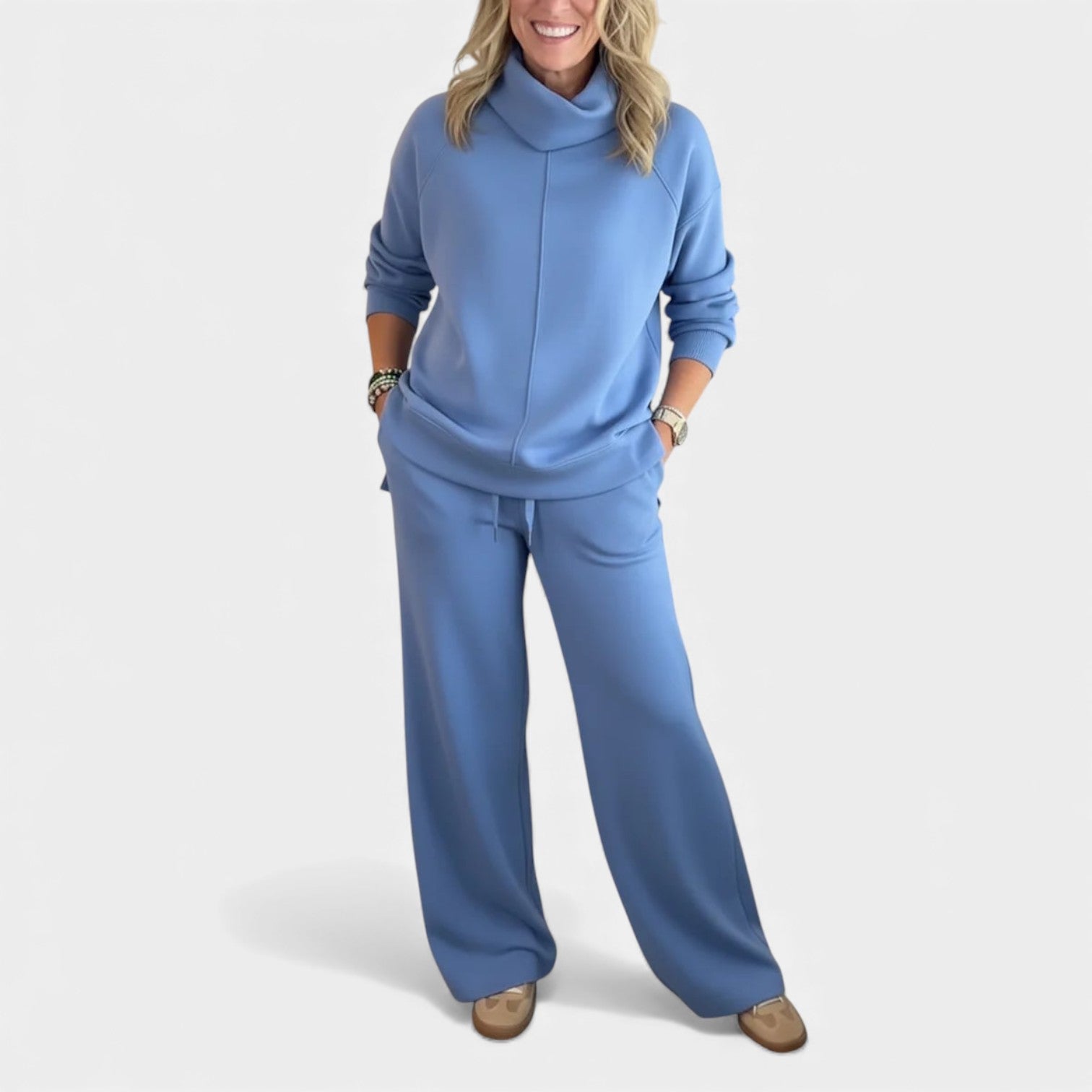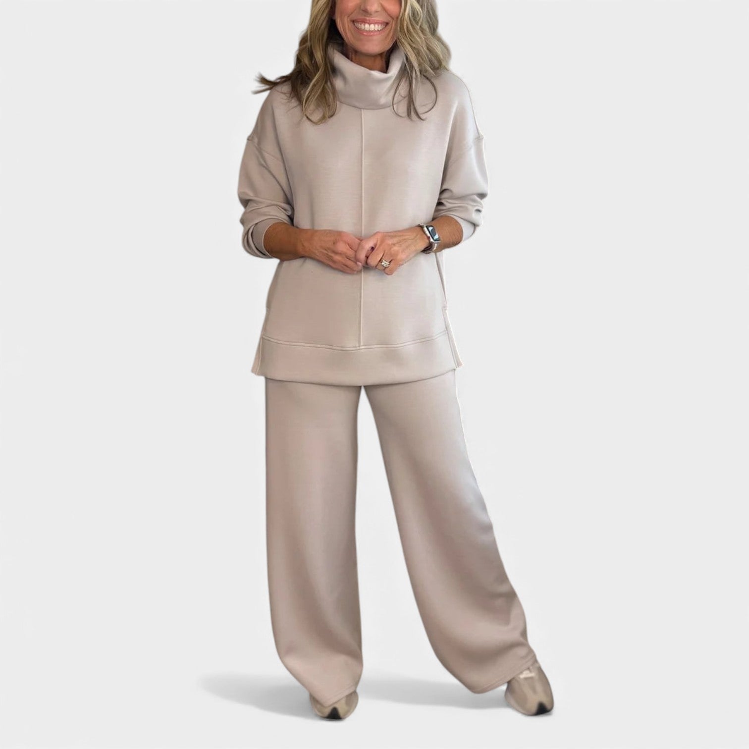 Komplet Marjeta je navržen pro ženy, které chtějí vypadat upraveně a zároveň se cítit mimořádně pohodlně. Měkká pletenina, volný límec a široké kalhoty vytvářejí vzhled, který je ideální pro cestování, práci nebo uvolněné dny doma.